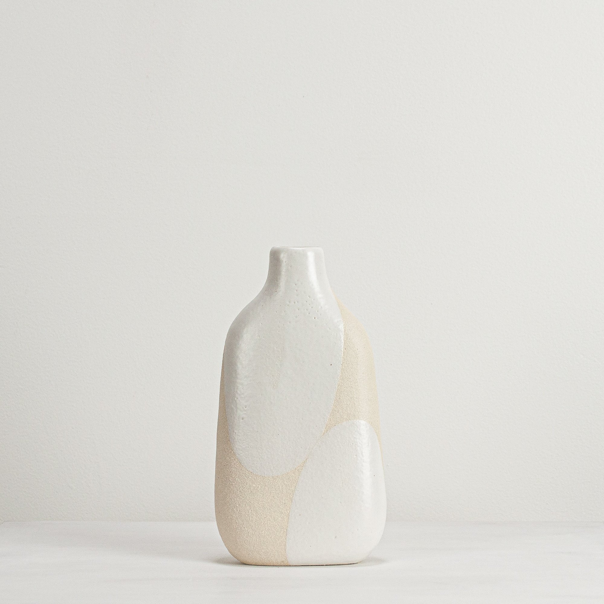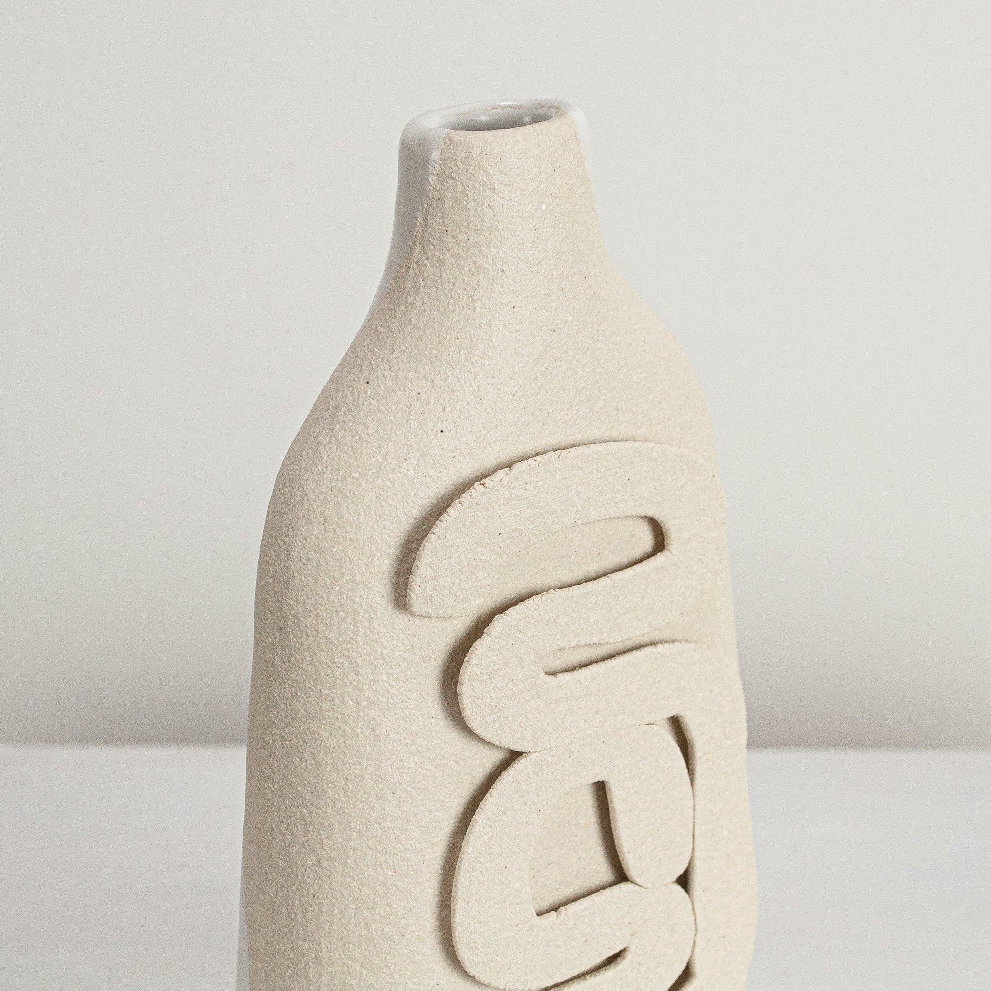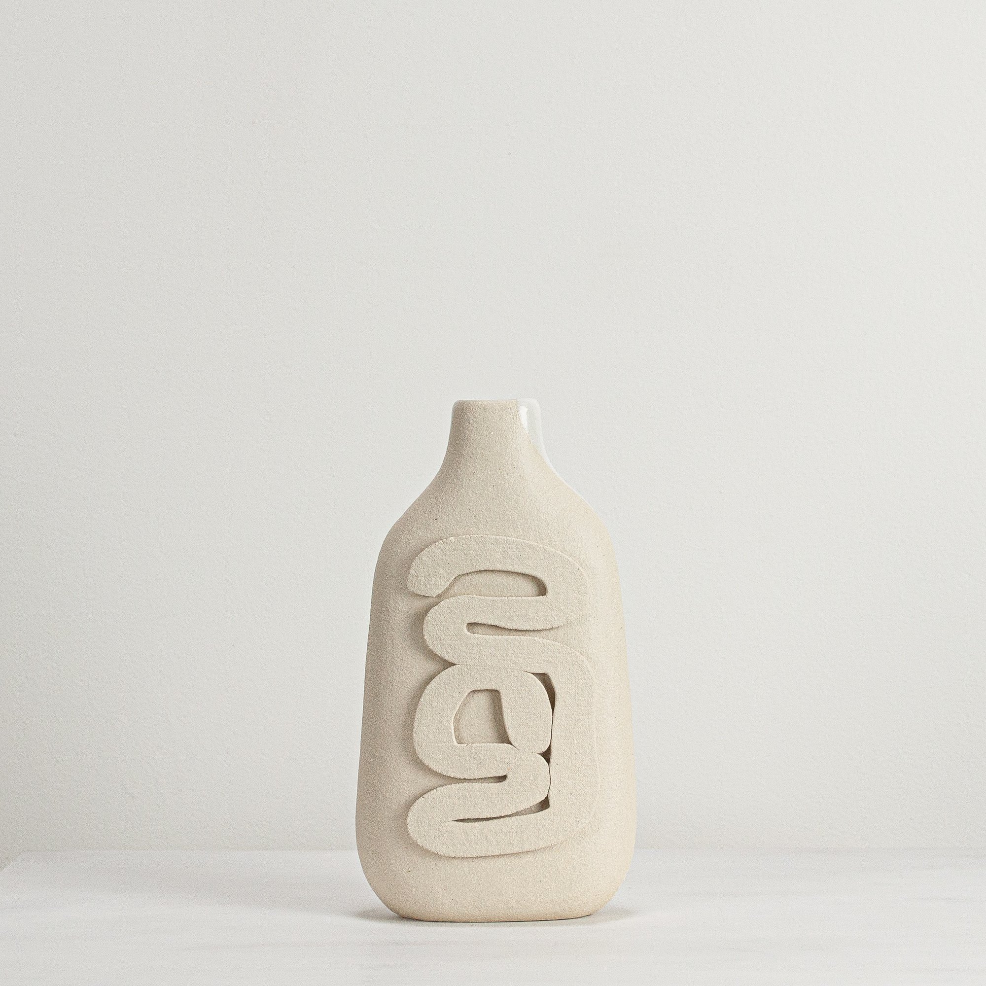 Unglazed stoneware sculptural vessel with a warm white, stoney finish, suitable as a vase.