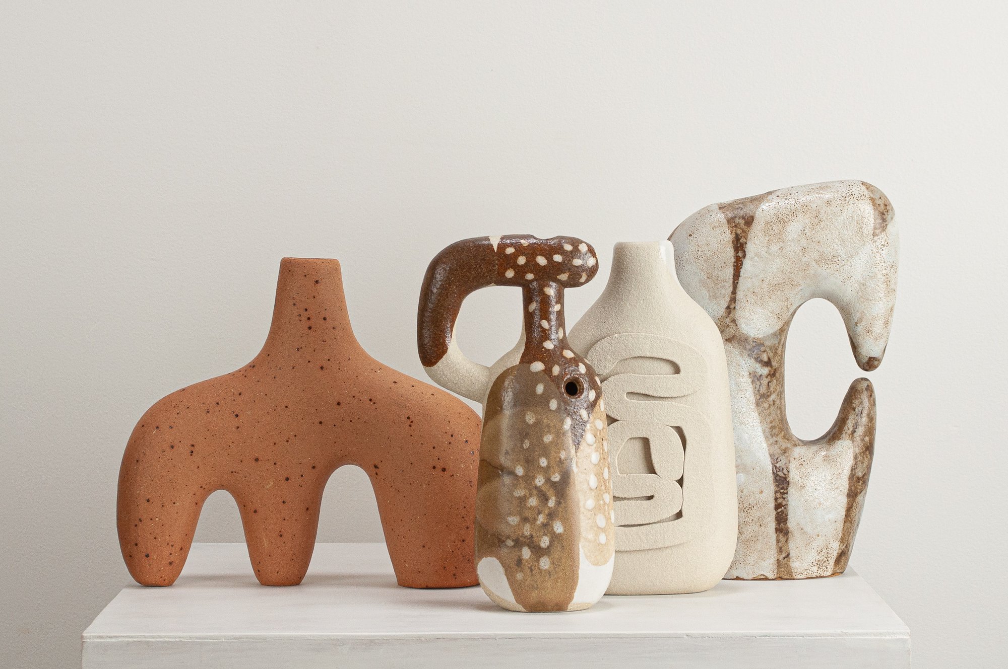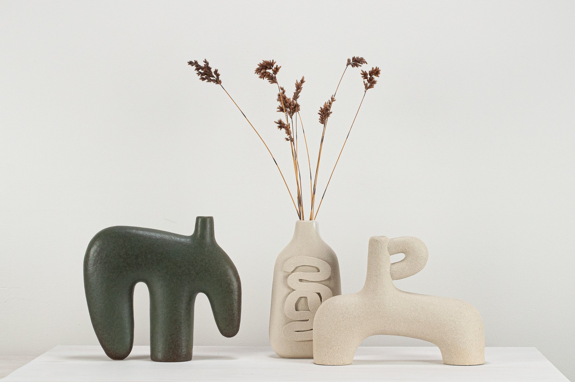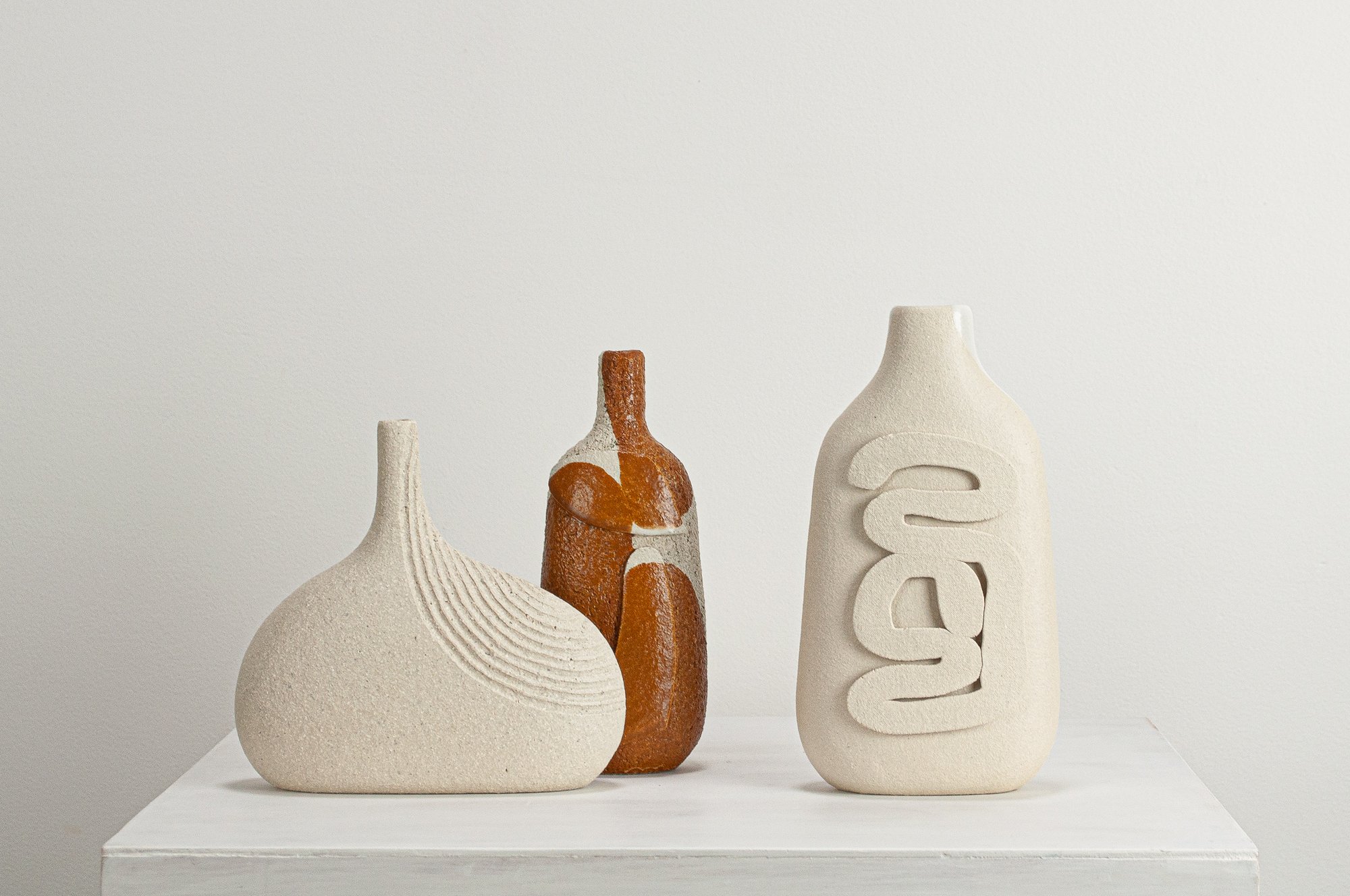 Unglazed stoneware sculptural vessel with a warm white, stoney finish, suitable as a vase.